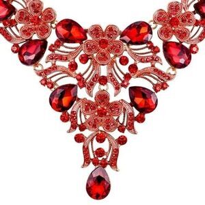 Yellow Gold and Ruby Red Austrian Crystal Floral Necklace and Earrings Set