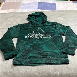 Stylish green camouflage hoodie. Features adidas logo on front. Comfortable and trendy.