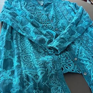 Johnny Was Teal Embroidered Cardigan