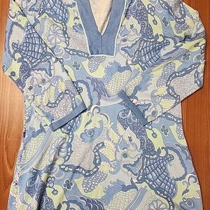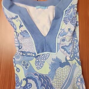 J McLaughlin Women's Blue Print Tunic Top Cover Up Size S V Neck Catalina Cloth