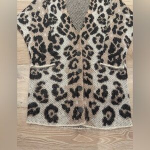 Chic Brochu Walker Leo leopard print sweater, can be worn as a coat or a mini dress. Long sleeves with front pockets and button closure.
