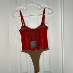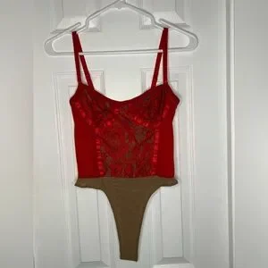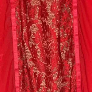 Chic red lace chemise with intricate detailing. Mesh along both sides, centers have lining beneath lace. Perfect for intimate evenings.