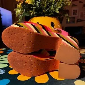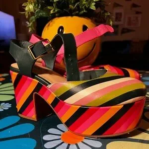 Vibrant platform shoes with bold stripes. Features pink, green, orange, and black colors. Adjustable ankle strap for secure fit. Perfect for a statement look.