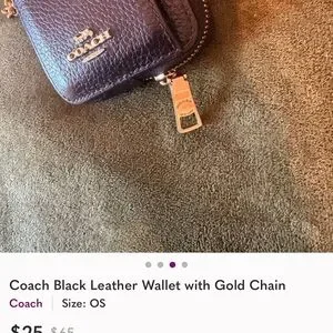 Sleek black leather card holder. Features a chic gold chain. Ideal for everyday use.