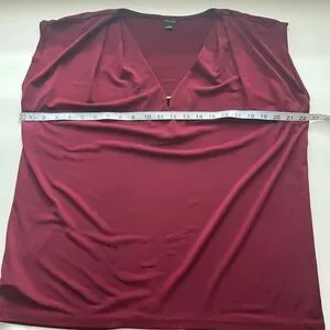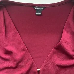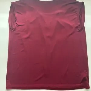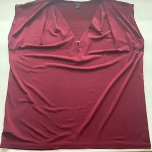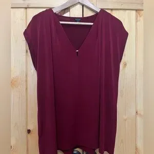 Chic deep red blouse with a flattering V-neck. Perfect for versatile styling. Size Large, Loose, drapey fit, some stretch. Pit to pit approx. 22.5” and approx. 25” long. Sleeves are somewhere between a cap sleeve and dolman. In very good condition, no obvious damage nor stains. Smoke free home.