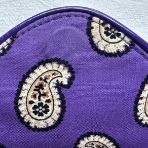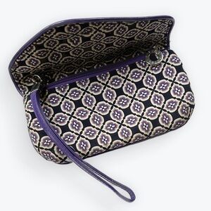 Retired “Simply Violet” pattern with two magnetic flaps revealing separate compartments. Detachable wrist strap; could carry as a clutch. The exterior side with the Vera Bradley ribbon does not have an exterior reach-in pocket. Instead, pockets are all protected inside the double magnetic flaps. Opening the outermost flap review reveals a purple paisley section, whereas opening the underneath flap reveals ID card pockets as well as a zipper pouch. This is also where the shiny purple wrist strap attaches. Very clean condition showing little if any wear. Approximately 4” x 7”