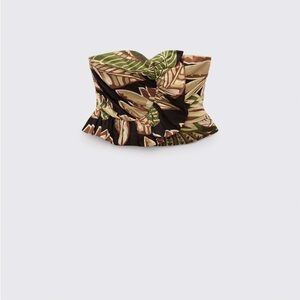 Stylish strapless top with a leaf print design. Features shades of green, brown, and tan.