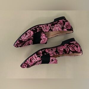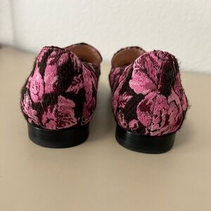 These elegant loafers from Kate Spade feature a striking pink and black floral design with a black ribbon strap across the top on a classic flat silhouette. The ornate brocade-style fabric adds a touch of vintage charm, while the slip-on style ensures comfort and ease. Perfect for adding a sophisticated flair to any ensemble.