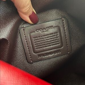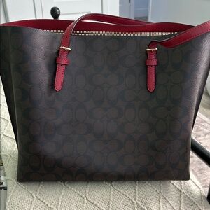 Stylish Coach tote with dark brown pattern. Bold red straps and interior. Perfect for daily use.