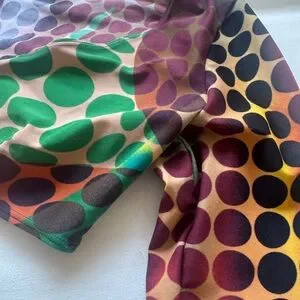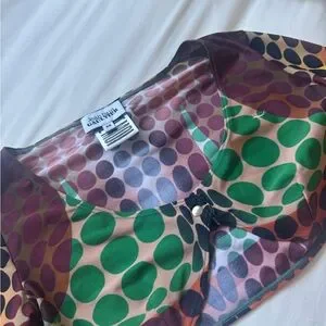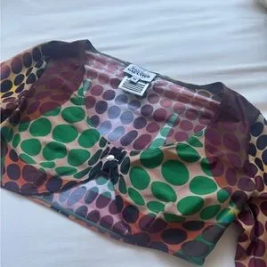 Stylish crop top with long sleeves. Features a bold multicolor dot design.