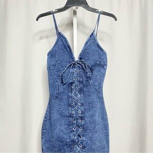 ⁞ windsor denim dress lace up mini bodycon sleeveless spaghetti straps casual trendy