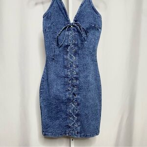 Sleeveless denim mini dress featuring a lace-up front detail, adjustable spaghetti straps, and a bodycon fit. Perfect for a trendy casual look.
