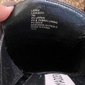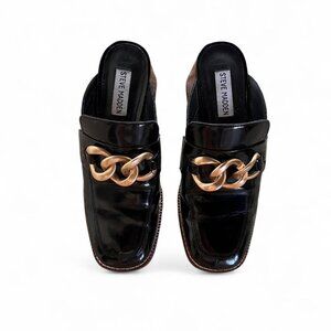 Black Steve Madden faux patent leather mules with gold chain detail