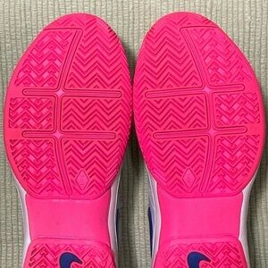 Nike Womens Platinum Zoom Prestige Tennis Athletic Sneakers Shoes. Color: Platinum w/Blue Swoosh and Pink Soles. Pre-owned – refer to pictures. No rips or tears. Smoke free.