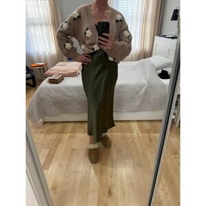 Cozy beige knit cardigan by LUNA ITY featuring adorable cream crochet flowers with green leaves. Soft chunky texture, relaxed fit, and button-down front. Perfect for layering in fall or spring. Gently worn once, in excellent condition.