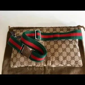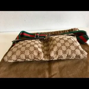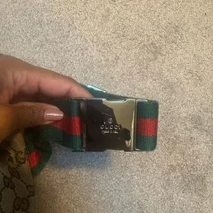 Stylish Gucci crossbody bag in classic GG pattern. Features a bold red and green strap. Perfect for everyday use.