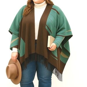Elevate your Fall wardrobe with this timeless and sophisticated reversible ruana wrap. Featuring an abstract design in turquoise blue on one side and dark chocolate brown on the other, this luxurious cape blends quiet luxury with everyday wearability