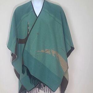 Reversible Ruana Wrap Cape Turquoise & Brown Soft Knit Boho Fringe Shawl XL 1 sz