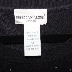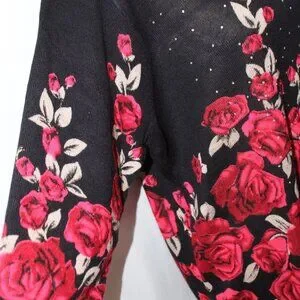 Rebecca Malone Black With Red and Tan Roses and Bling Sweater. Black scoop neck sweater with red and tan roses and rhinestones for added bling. Size 1X. In excellent preowned condition. Chest measurement is approximately 23.5” when sweater is lying flat.
