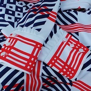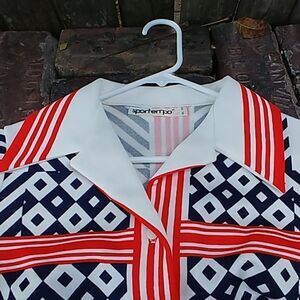 Ahoy matey! This red white and blue number belongs on a boat with some yacht rock playing in the background. Tag says Sportempo 100% polyester. Vintage size 10. Measurements laid flat: bust 18", sleeve 23" shoulder to cuff, 26" collar to hem. Very good vintage condition. The white is still bright white! No stains or picks. Nice trio of buttons at each cuff.