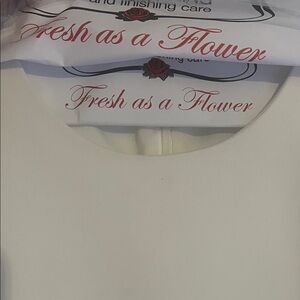 Elegant white mini dress. Features a feathered hem. Sleeveless design. Perfect for special occasions. Worn one time on my wedding night after party.