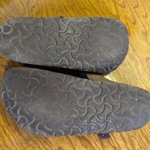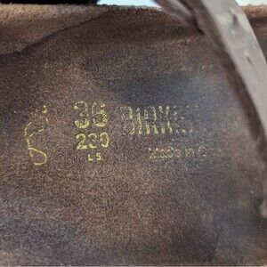 Fair Condition. There is wear and discoloration to the footbeds (see pictures). There is some damage to the backs of the heels on both shoes and to the side of one shoe where the cork is lifting a bit (see pictures). There is wear to the treads (see pictures).