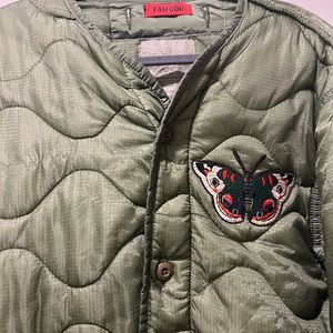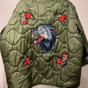 vintage army surplus jacket. With embroidered patches seen on front and back