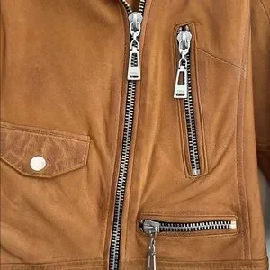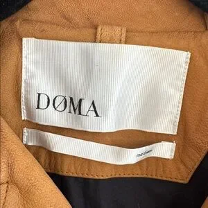 Never worn. Stylish Doma leather jacket in rich brown. Features silver zippers and snap details. Perfect for versatile wear.