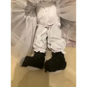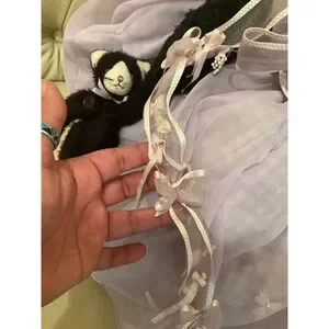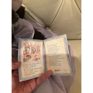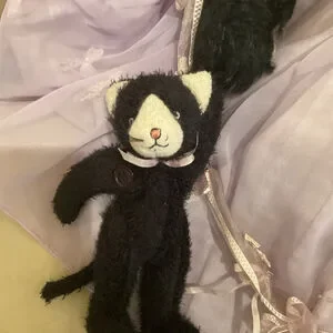Charming Bunnies By The Bay “And Friends” black and white cat plush dressed in a lavender gingham gown with sheer overlay, ribbon bows, and matching sunhat. She holds a small black kitten doll with a button arm and pink ribbon collar. Comes with original hang tag.