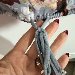 Chic off-shoulder blouse with floral print. Features gray and blue tones. Ideal for casual outings.