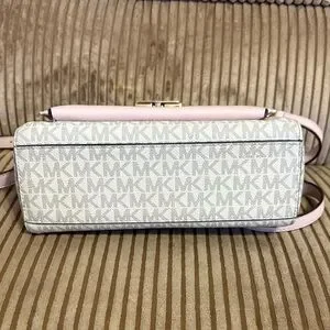 Stylish crossbody bag with signature MK pattern. Features pink accents and gold chain detail. Ideal for everyday elegance.