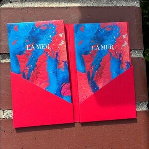 Elegant La Mer gift box. Vibrant red with embossed design. Perfect for gifting.