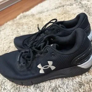 Sleek black sneakers featuring a silver Under Armour logo. Ideal for active and casual use.