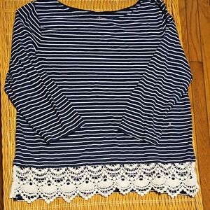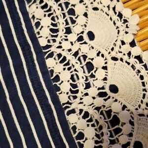 Chic navy and white striped top. Features elegant lace hem. Ideal for versatile styling.
