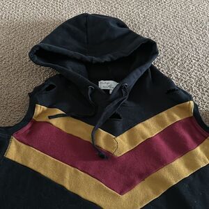 Vintage Havana Women’s Hooded Black Cold Shoulder Ripped Sweatshirt. Maroon & rust colored color block. Front pocket. Made of cotton & polyester. Size S. 21” pit to pit. 22” shoulder to bottom hem.