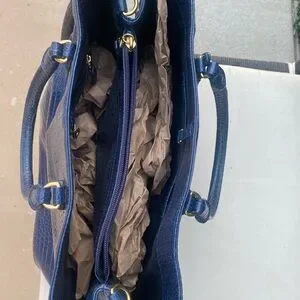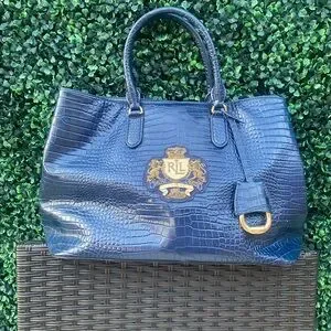Elegant royal blue satchel with croc-embossed texture. Features gold-tone hardware and Ralph Lauren crest. No strap.