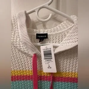 White knit hoodie with pink, yellow, and blue stripes. Features a cozy design.