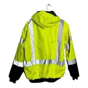 High-visibility safety jacket designed for optimal protection and comfort in demanding work environments. This bright yellow jacket features reflective strips for enhanced visibility in low-light conditions, alongside a fleece lining for added warmth and comfort during colder weather. The jacket includes a hood for protection against the elements and multiple pockets for convenient storage of essential items. Ideal for construction workers, traffic controllers, or anyone working in environments where visibility is crucial.
