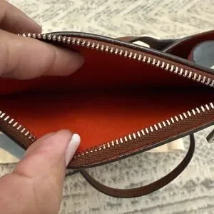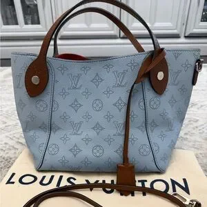 Chic Louis Vuitton Hina PM tote with iconic monogram. Rare light blue with brown accents. Perfect for stylish outings. 7.25" height. Base length 9". Check photos for small damage on pouch interior. Perforated leather.