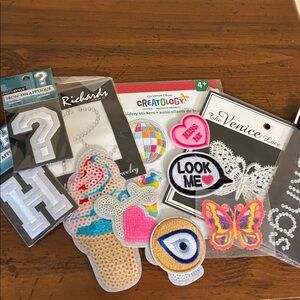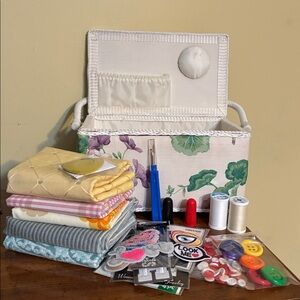 -stocked with 2 spools thread, 2 thimbles, seam ripper, dozens of buttons, 14 embroidery patches, Taylor’s chalk, 5 pieces of fabric/each about 18x18”
