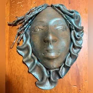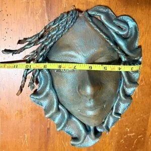 Hanging wall leather face decor .Has a blueish grey shimmering paint that catches and reflects light, creating a brilliant, dazzling,or multi-dimensional shimmer that can look different depending on the viewing angle.The materials used are all leather & paint.This piece of art is in very good condition.
