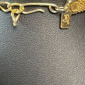 Elegant vintage Lisa signed gold-tone mesh choker necklace featuring a filigree center medallion accented with faux pearls and sparkling rhinestones. The triple-chain tassel adds graceful movement and a touch of 1980s glamour.