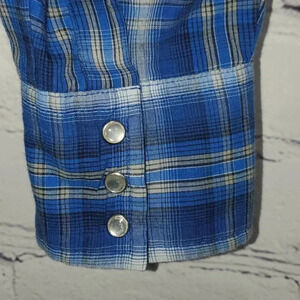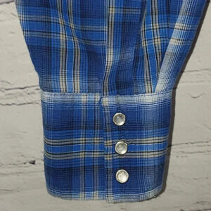 Wrangler Wrancher Pearl Snap Large Blue Plaid Shirt Western Cowboy Cotton Blend