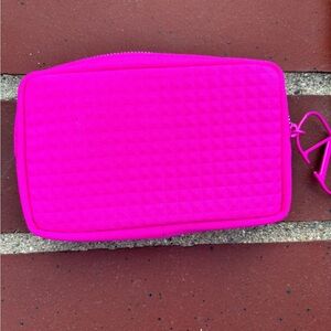 Bright pink quilted pouch. Perfect for small essentials. Stylish and compact.