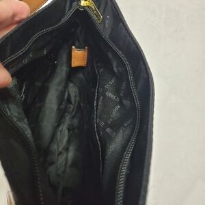 Black nylon crossbody shoulder bag with gold hardware. Features a zipper top closure, multiple compartments, and an adjustable long strap. #crossbodybag #shoulderbag #nylonbag