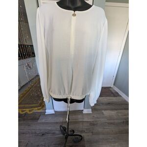 Tommy Hilfiger XL White Textured Drawstring Shirt Top Gold Zip Up Logo