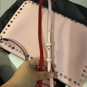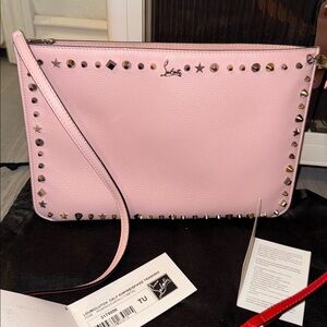 Elegant pink crossbody bag with striking stud accents. Features signature Christian Louboutin style. Ideal for a chic look.