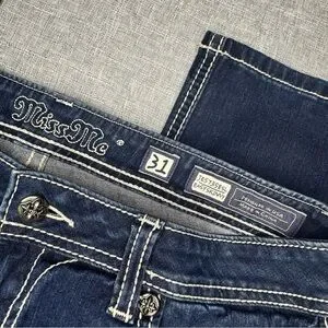 Miss Me Easy Skinny Fleur De Lis Sequin Bling Stretchy Dark Wash Jeans. Crystals rhinestone accents on the back pockets. Stretchy easy skinny style (extra room in the hips and thighs compared to regular skinny style). Like new. Size 31.