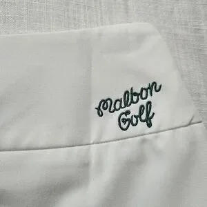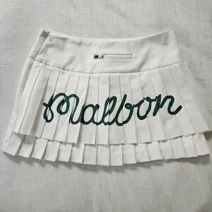 Malbon golf white pleated logo mini skirt in a size small or 64. Green logo on the back and a zip pocket. I am not familiar with this brand sizing and it is too small for me. I think it would fit an xs much better. It has been brought to my attention that it is shorter than the original photo, so I lowered the price. Feel free to ask any questions and I am open to reasonable offers