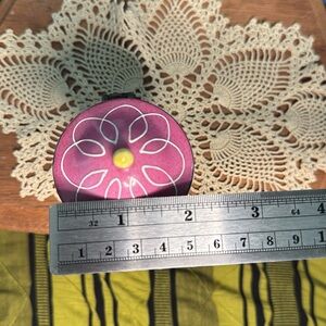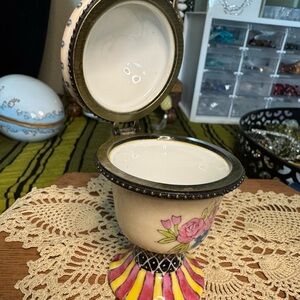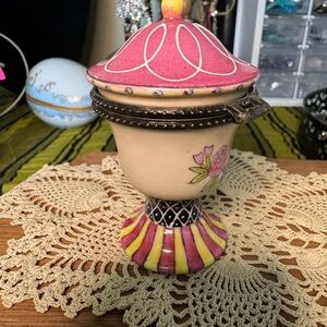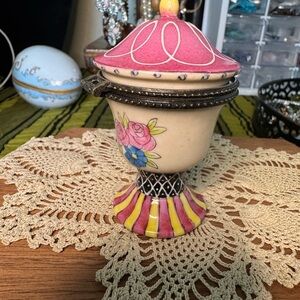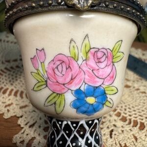 Decorative trinket box with floral, pink and yellow hand painted designs and florals on porcelain. Bronze tone metals. Perfect for storing small treasures. Measure approximately 3.75” x 2.25”. Possible maker sticker has been particularly worn off on bottom.
